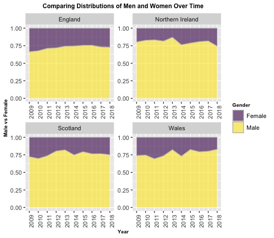 Wales: The female proportion of the distribution has almost halved in 2018 when compared to 2009.