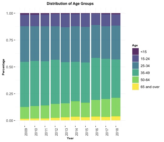 The distribution of new cases amongst the different age groups have each had moderate changes over the course of 10 years. Unlike most other age groups, those in age groups 50-64 and 65 and over increased in number of cases of HIV over the years, thereby increasing their distribution within all new diagnosis.