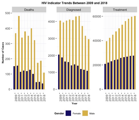 The number of deaths due to HIV fluctuated between 2009 to 2015. Deaths of men and women follow a parallel pattern, albeit at a much different scale. Within 2 years (2014 to 2016) the number of deaths per annum due to HIV fell by over 50% for both genders. It is important to note that death is impacted by factors such as past diagnoses, CD4 levels at diagnosis, and quality of treatment