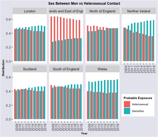86.5% of cases during 2009 to 2018 HIV was contracted through behavioural exposure (either from sex between men or heterosexual contact). The graphs below show how these two subcategories of exposure compared to one another for new HIV cases over the years. In many regions sex between men and heterosexual contact are equally responsible for spreading HIV, although over time the portion due to sex between men grows (and in most regions outweighs heterosexual contact). Unlike the majority of the UK, heterosexual contact is the main cause of spreading HIV within the Midlands and East of England. This growing concentration of HIV contact from sex between men correlates to why new cases of HIV are continuously more likely to be from men than women.