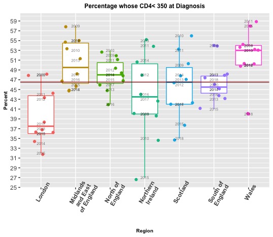 Approximately 47% of HIV cases are diagnosed when CD4 levels are dangerously low (below 350). The worst case occurred in Wales in 2011, when 59% of HIV diagnoses had CD4 levels below 350, and in the best circumstances in Northern Ireland in 2015 when 27% of HIV diagnoses had CD4 levels below 350. The varying lengths of the interquartile ranges for the different regions demonstrate how inconsistent regions are at identifying HIV. Generally, London has diagnosed HIV positive persons when their CD4 levels are higher than 350, which gives them a better survival rate. Conversely, Wales is almost always worse than average, but did improve in 2014 by spotting 60% of new cases before CD4 levels dipped below 350.