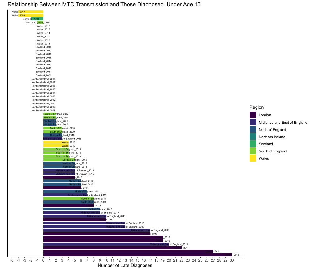 The relationship between MTC transmission and diagnosis under age 15 shows us how many children living with HIV are unaware of their condition, as they have either not yet been diagnosed or were diagnosed at a much later age even though they contracted HIV pre/post birth. In cities where there are fewer cases of HIV, medical doctors have been better at catching HIV early; in contrast, larger cities such as London were more likely to leave cases undiagnosed. This could be because the doctors were unaware of the mother's HIV status.