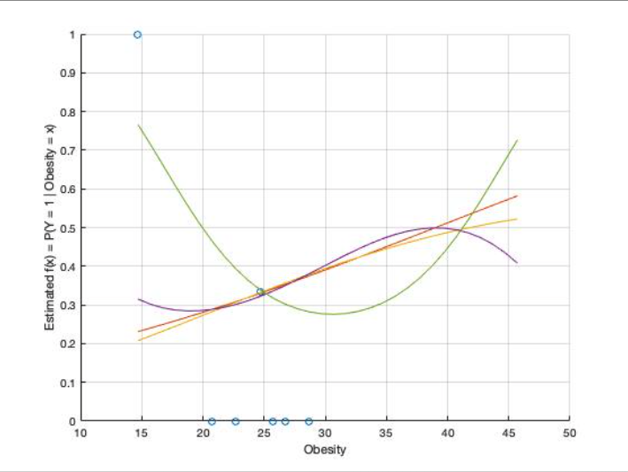 (R) Figure 5: Plot of linear (orange), quadratic (yellow) and cubic (purple) equations of obesity, and \(\mu(x)\) = obesity, obesity2 (green)