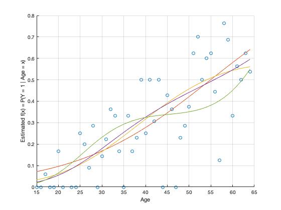 (L) Figure 4: Plot of linear (orange), quadratic (yellow) and cubic (purple) equations of age, and \(\mu(x)\) = age, age2 and age3 (green)