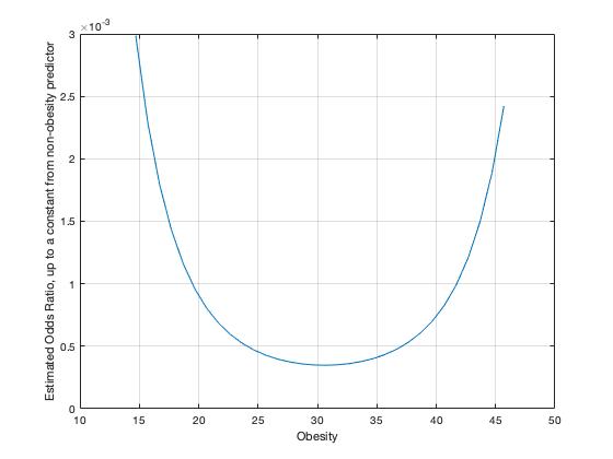To understand how the predictors age and obesity have impacted the model the following is plotted for each \(e^{x_i\beta_{age}+ x_i^2\beta_{age^2} +x_i^3\beta_{age^3}}\) and \(e^{x_i\beta_{obesity}+ x_i^2\beta_{obesity^2}} \) respecitvely.
