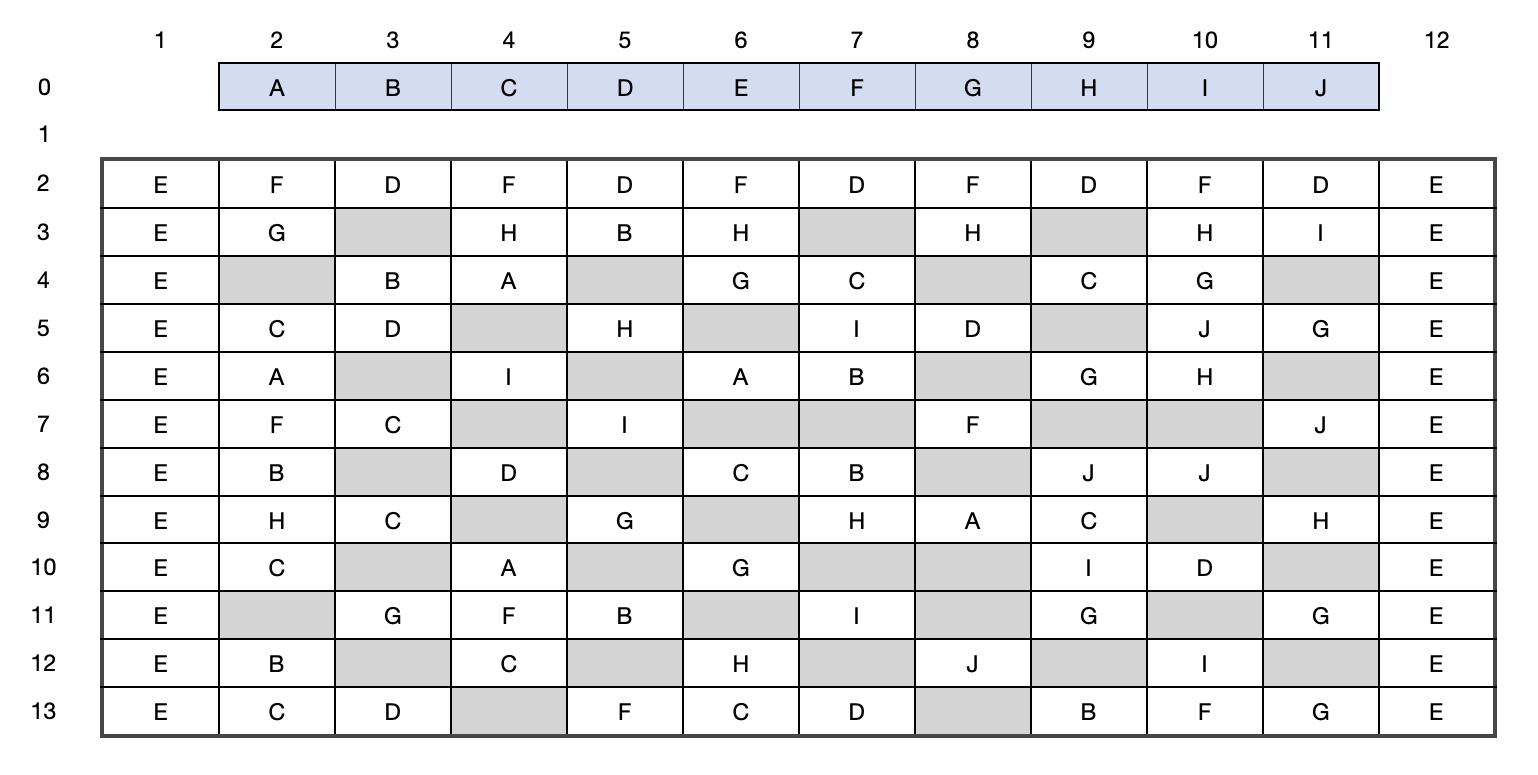 Figure 1: Diagram of PCB, feeders are blue, components white, and empty cells grey. The outer axis labels identify the position of each component. Example: the first G component in the second column has the position (2, 3).